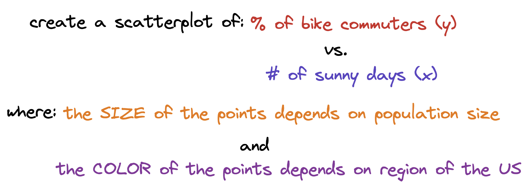 We map variables (columns) from the data to aesthetics on the graphic useing the aes() function.