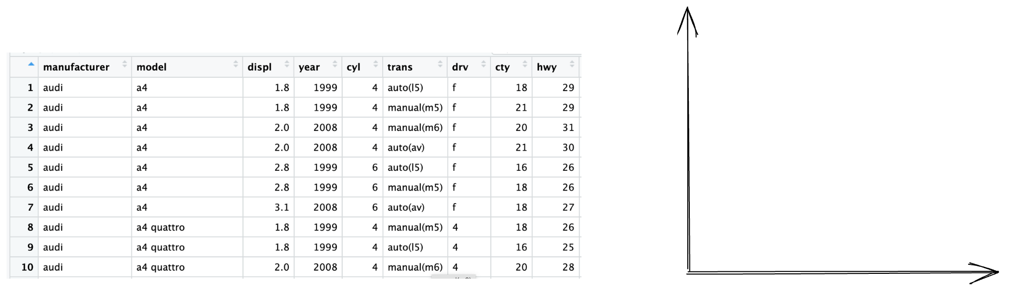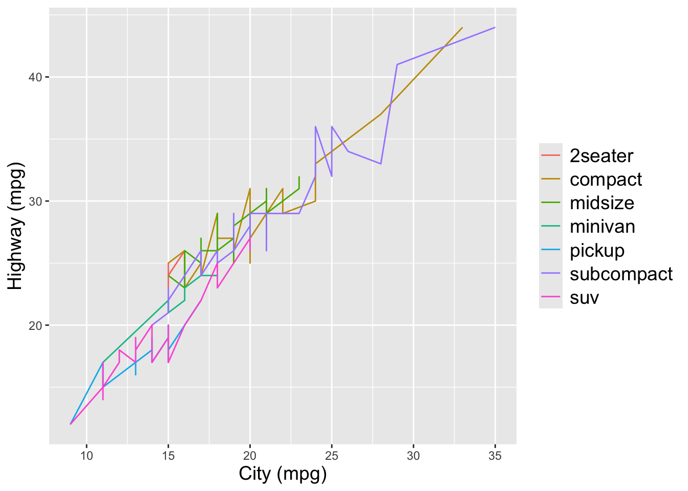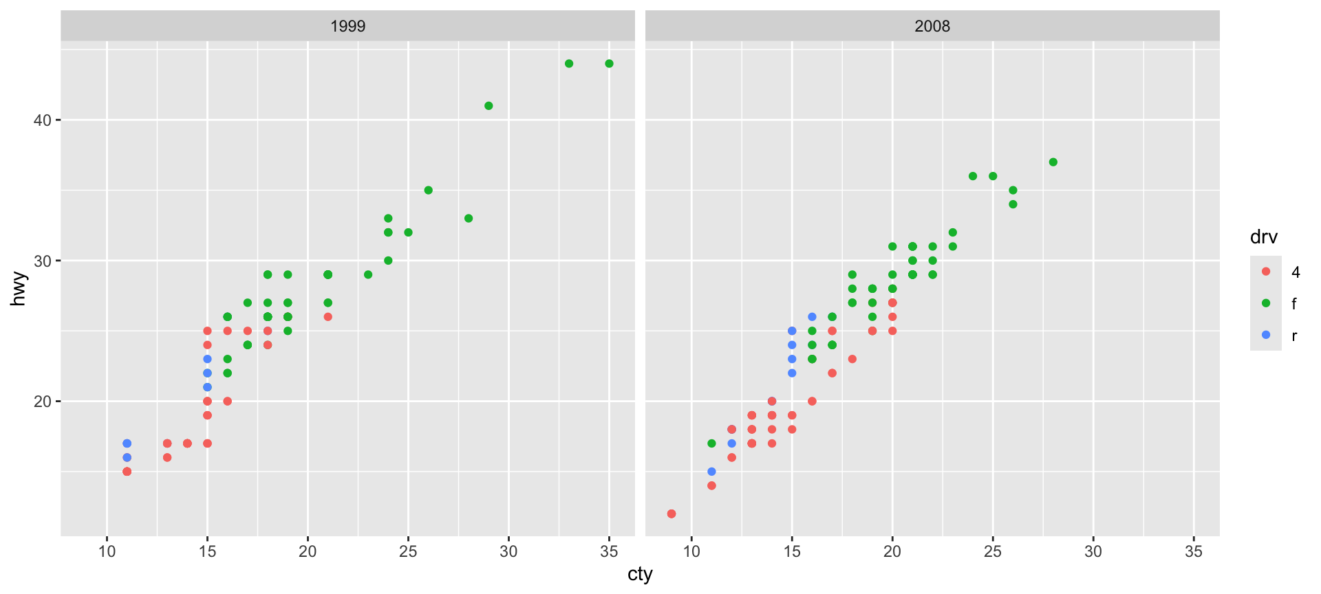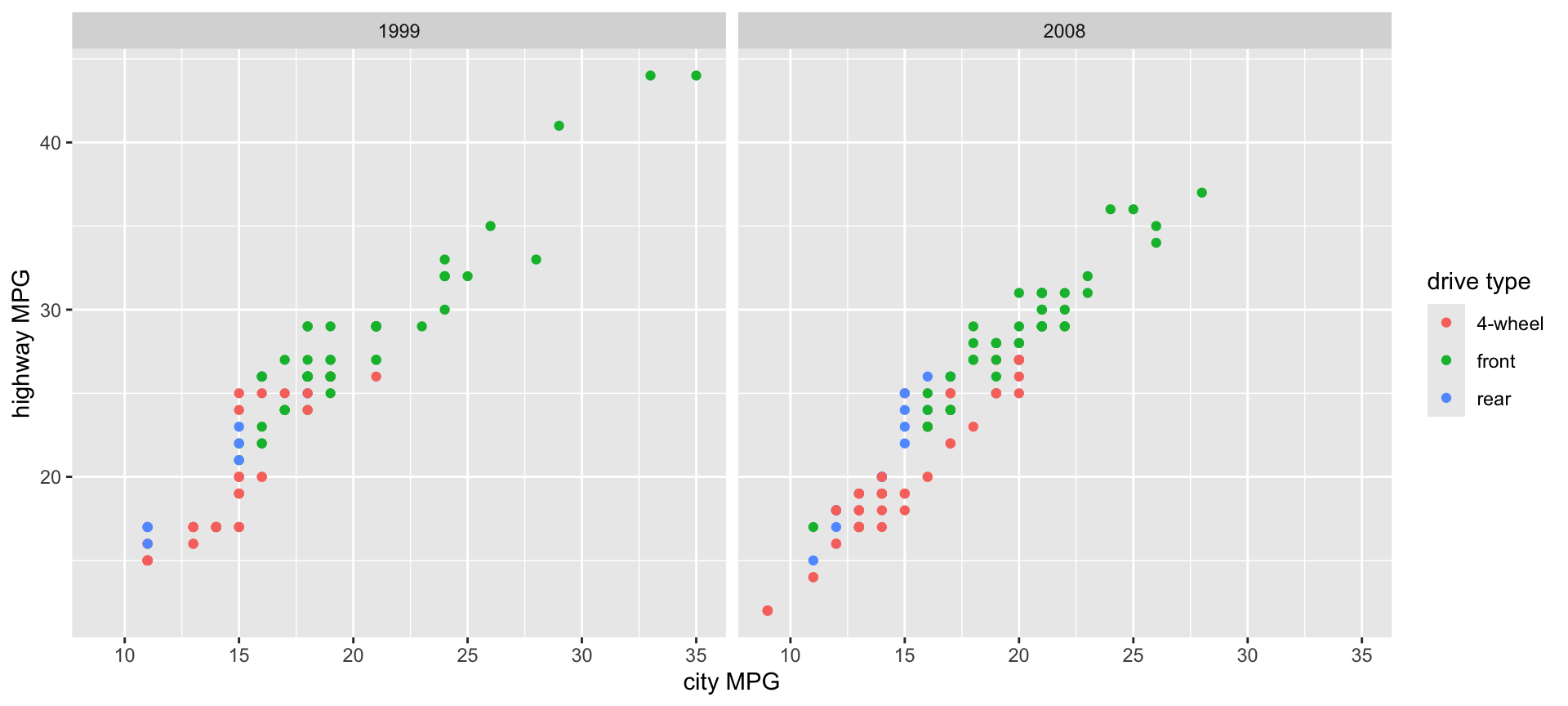 geom do you need?aes’s do you need?Use the mpg dataset to create two side-by-side scatterplots of city MPG vs. highway MPG where the points are colored by the drive type (drv). The two plots should be separated by year.