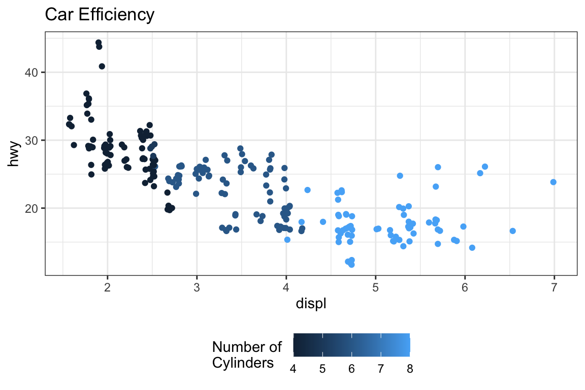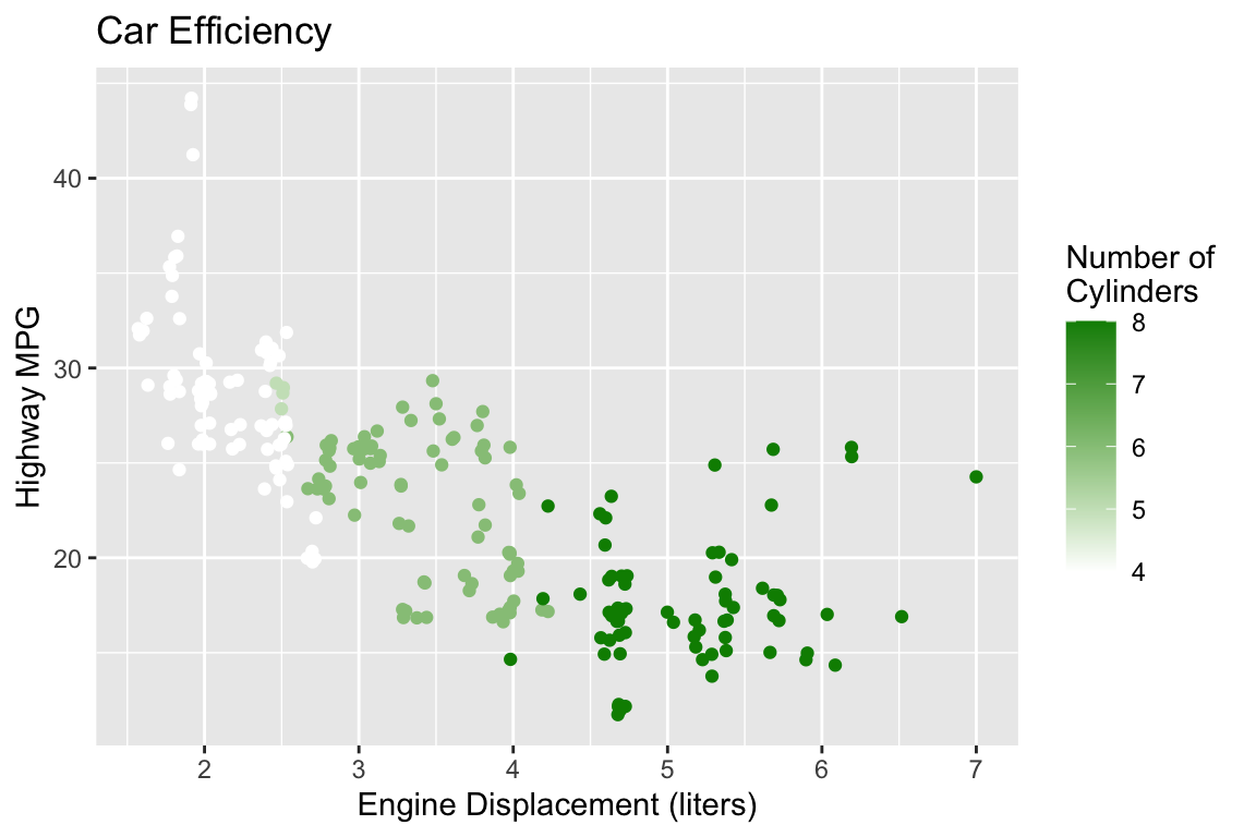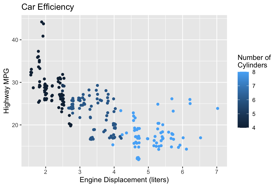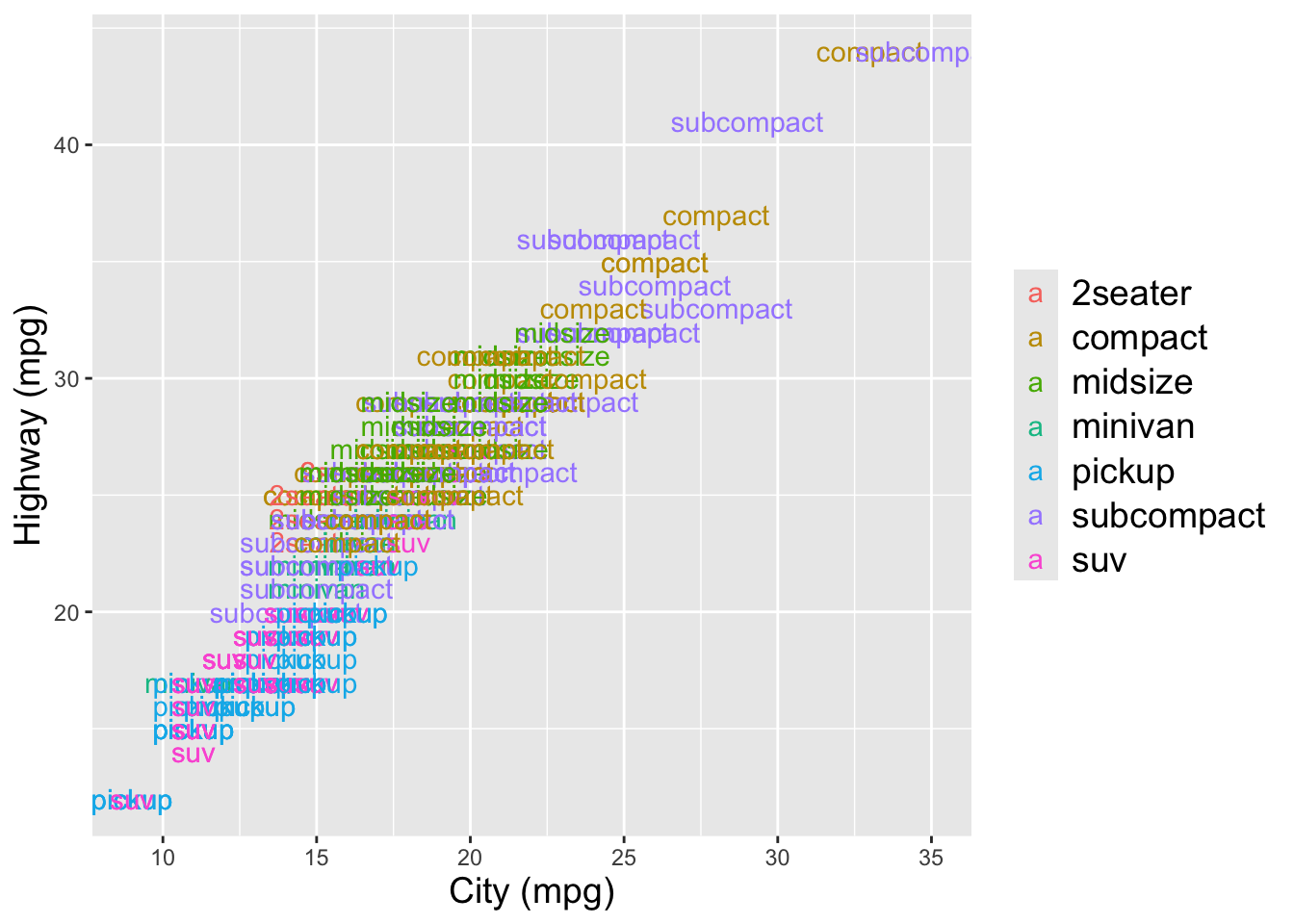 geom do you need?aes’s do you need?Use the mpg dataset to create two side-by-side scatterplots of city MPG vs. highway MPG where the points are colored by the drive type (drv). The two plots should be separated by year.