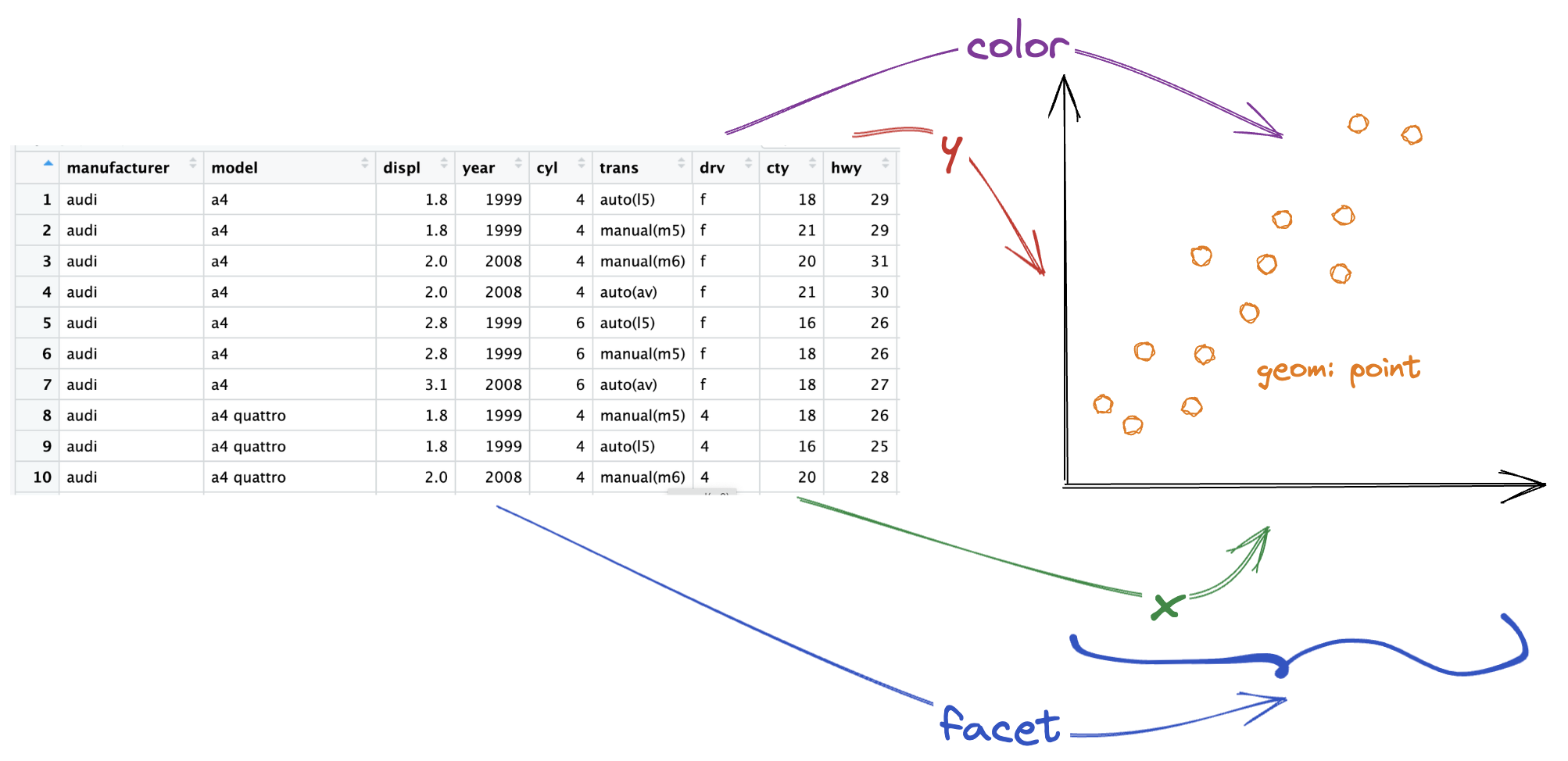 + to add layers to a graphic.We map variables (columns) from the data to aesthetics on the graphic useing the aes() function.