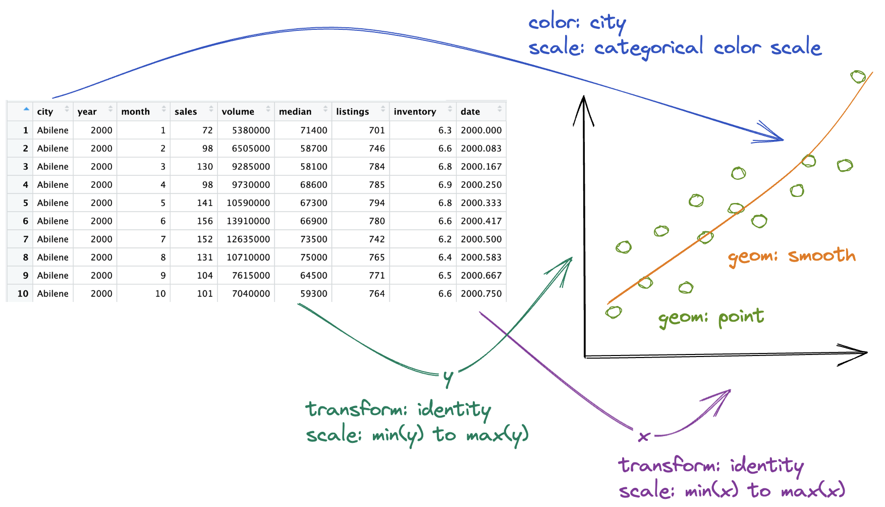 identity leaves the data as is.count counts the number of observations.summary allows you to specify a desired transformation function.Sometimes these statistical transformations happen under the hood when we call a geom.
