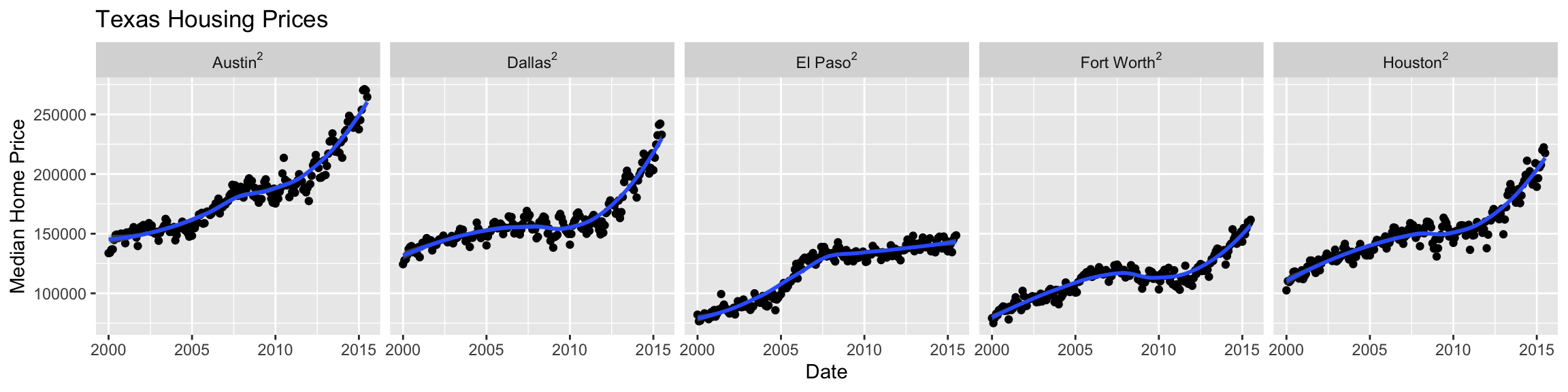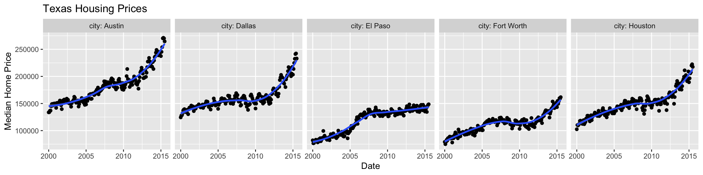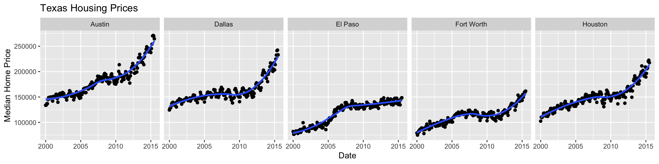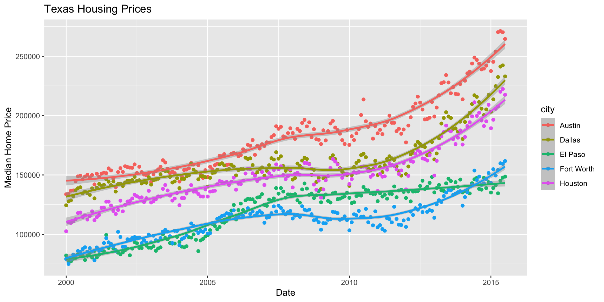 Make a plot of median house price over time (including both individual data points and a smoothed trend line), distinguishing between different cities.