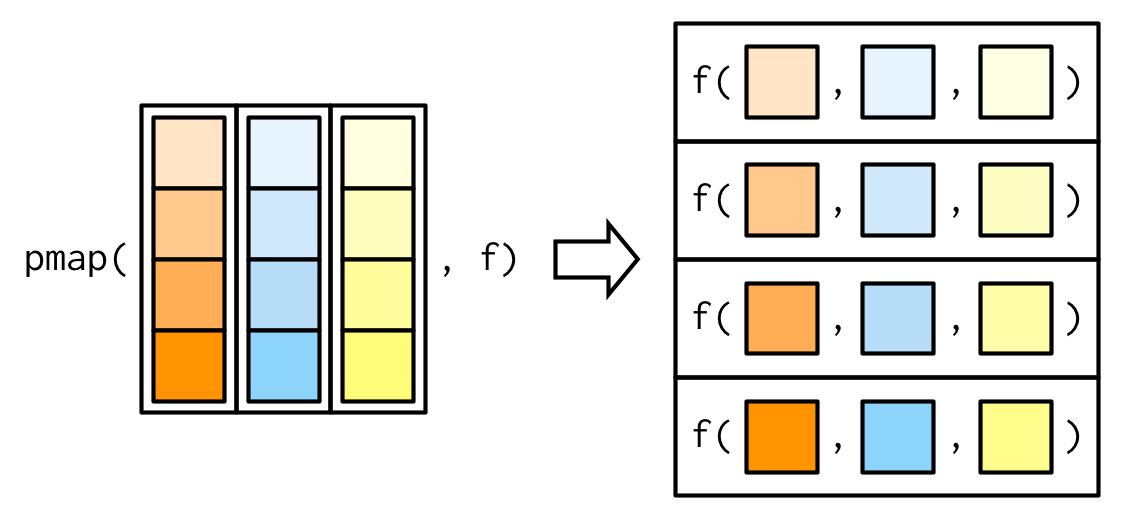 pmap() FamilyThe vectors need to have the same names as the arguments of the function you are applying.