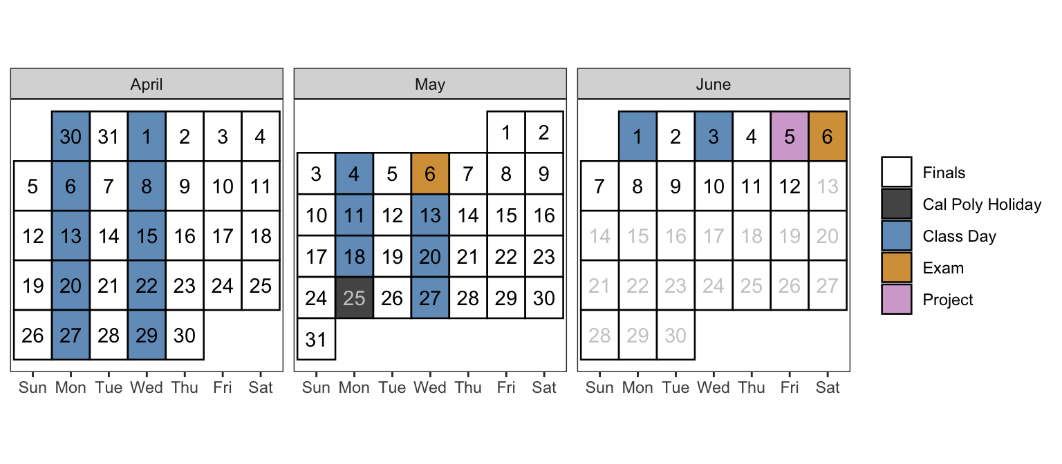 If you are experiencing food insecurity, housing instability, or other challenges that may impact your ability to succeed in this course, please refer to the resources listed on Canvas under “Student Support Services at Cal Poly.” These resources provide a range of essential support services, including emergency financial assistance, counseling, and academic support.
