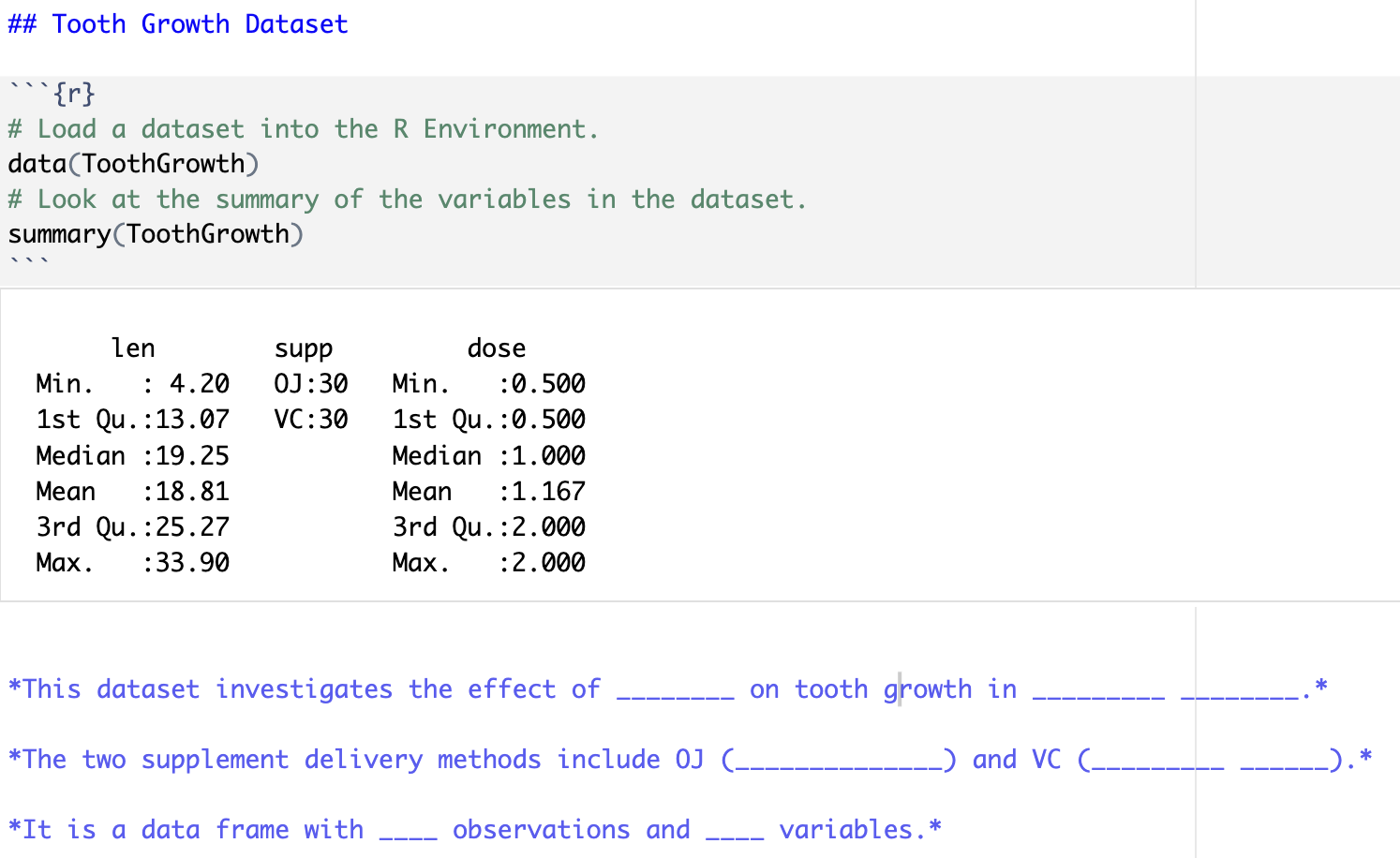 Your Tooth Growth Dataset section should look something like this (although it will also include the table of supp):